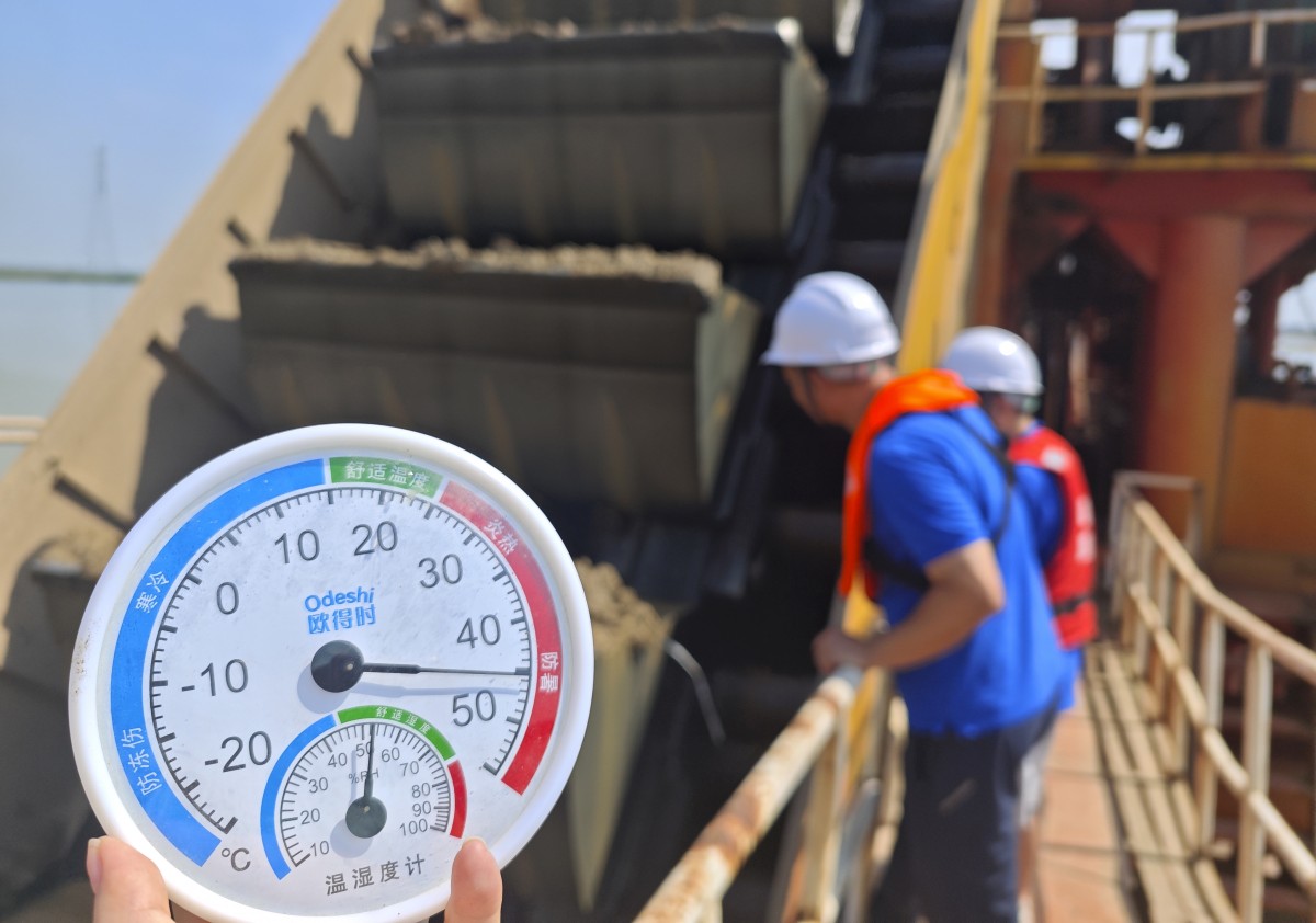 姜奇是贛昌砂石公司開(kāi)采管理中心班長(zhǎng)、中共黨員,負(fù)責(zé)贛撫尾閭采砂船現(xiàn)場(chǎng)管理工作。入伏以來(lái),南昌持續(xù)高溫天氣,而采砂船上的實(shí)際氣溫更是高達(dá)40度以上,中午最高氣溫可達(dá)50攝氏度,船上不但炎熱憋悶,噪音更大,“咣當(dāng)咣當(dāng)”的機(jī)器作業(yè)聲響?yīng)q如身處沒(méi)有空調(diào)的綠皮火車車廂里。他們每天要在采砂船上工作10余個(gè)小時(shí),量船、檢查設(shè)備、查看砂質(zhì),這些工作都需要在船艙外進(jìn)行,頭頂著烈日,汗流浹背是再正常不過(guò)的事,身上的藍(lán)色工作服濕了又干、干了又濕……