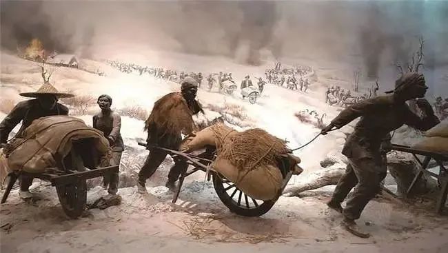 據(jù)不完全統(tǒng)計(jì),淮海戰(zhàn)役中,山東地區(qū)支前民工出動(dòng)88萬(wàn)輛大小車輛,向前線運(yùn)送原糧兩億多公斤,在惡劣的戰(zhàn)爭(zhēng)環(huán)境和交通條件下,支前大軍用一輛輛小推車將補(bǔ)給源源不斷地運(yùn)往前線。