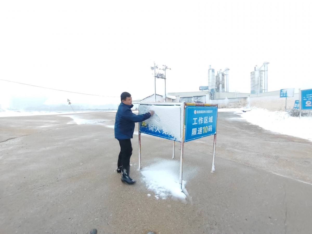 ▲砂海黨支部應(yīng)急突擊隊(duì)對(duì)廠區(qū)路面及指示牌積雪進(jìn)行清理