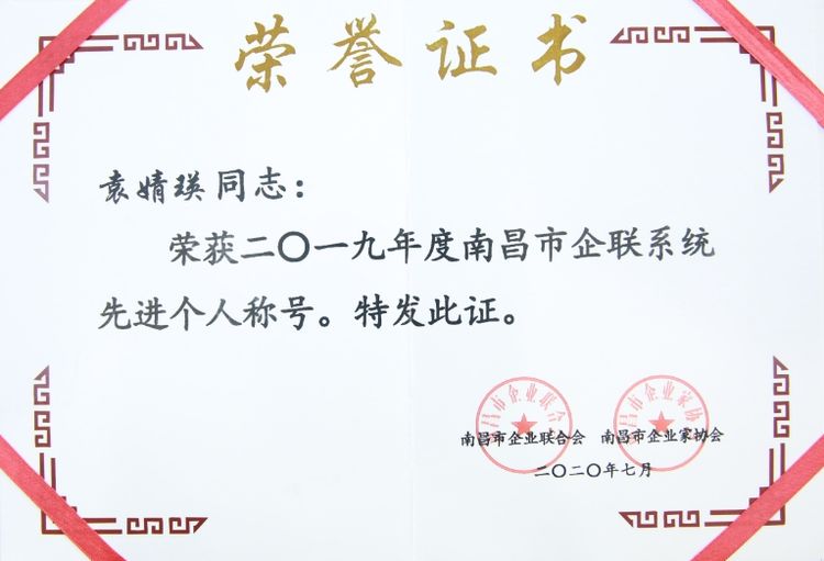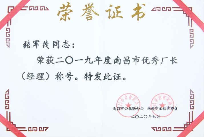 贛昌砂石公司榮獲“2019年度南昌市優(yōu)秀企業(yè)”、“2019年南昌市工業(yè)企業(yè)納稅30強(qiáng)”,總經(jīng)理陳鴻被評為“2019年度南昌市優(yōu)秀企業(yè)家”,副總經(jīng)理張軍茂被評為“2019年度南昌市優(yōu)秀廠長(經(jīng)理)”,綜合部部長袁婧瑛被評為“2019年度南昌市企聯(lián)系統(tǒng)先進(jìn)個(gè)人”。