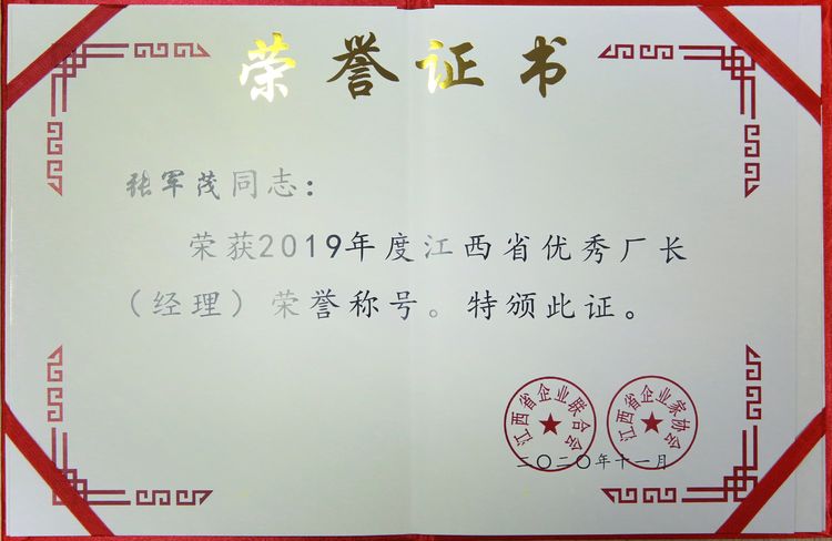 “2019年度江西省優(yōu)秀廠長(經(jīng)理)”