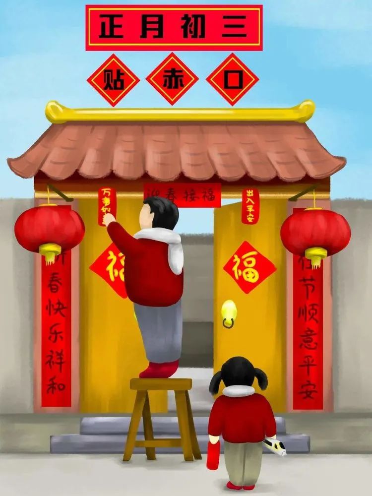 正月初三是“赤口”,又稱“赤狗日”。在我國南方,大年初三早上還要貼“赤口”,認為這一天里易生口角,不宜拜年。所謂“赤口”,一般是用長約七八寸、寬一寸的紅紙條,上面寫上一些出入平安吉利的話,貼在前門和后門的門頂上,另外有一張是放在垃圾上挑出外面倒掉。這些垃圾都是初一、初二兩天積下來的,一定要到初三才能一起清理倒掉,否則,等于把家中的金銀財寶向外倒掉一樣。