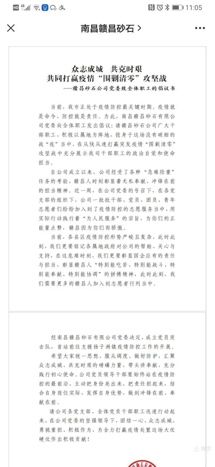 連日來,隨著疫情防控工作的展開,防控點(diǎn)任務(wù)繁重,責(zé)任重大,揚(yáng)子洲鎮(zhèn)疫情防控工作人員緊缺。劉順保得知揚(yáng)子洲鎮(zhèn)的困難后立即響應(yīng),3月22日,南昌贛昌砂石有限公司黨委發(fā)布《致全體職工的倡議書》,向公司各黨支部召集50余名志愿者,并成立黨員先鋒隊(duì),協(xié)助揚(yáng)子洲鎮(zhèn)開展疫情防控工作。他說:“只要組織有需要,我們贛昌人就頂上,這場(chǎng)沒有硝煙的戰(zhàn)爭(zhēng),終將迎來勝利。”
