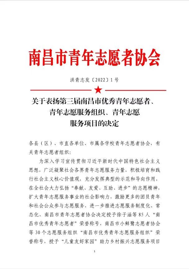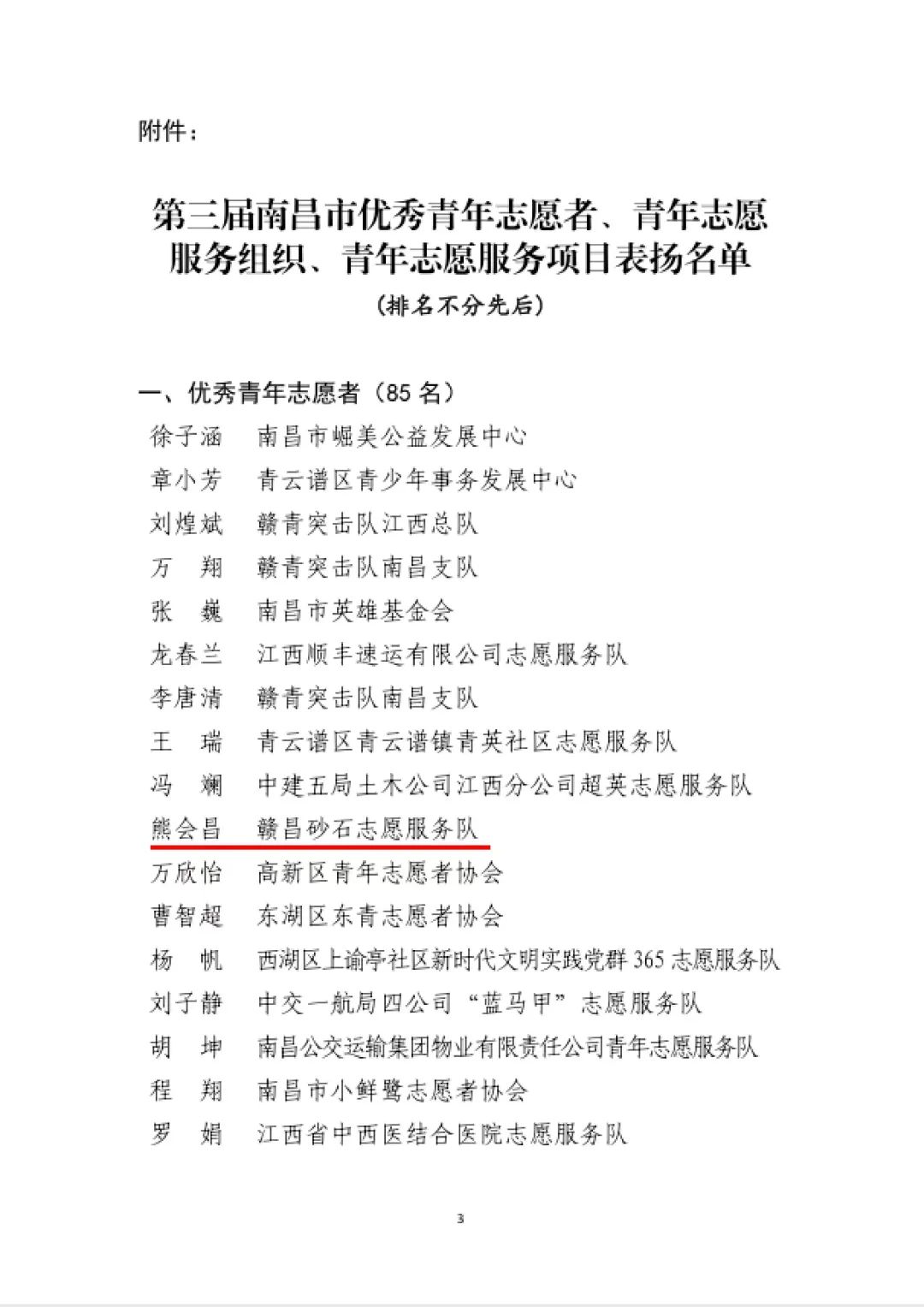 近日,南昌市青年志愿者協(xié)會公布《關(guān)于表揚第三屆南昌市優(yōu)秀青年志愿者、青年志愿服務(wù)組織、青年志愿服務(wù)項目的決定》,其中來自南昌贛昌砂石有限公司青年志愿服務(wù)隊的熊會昌受到表揚。