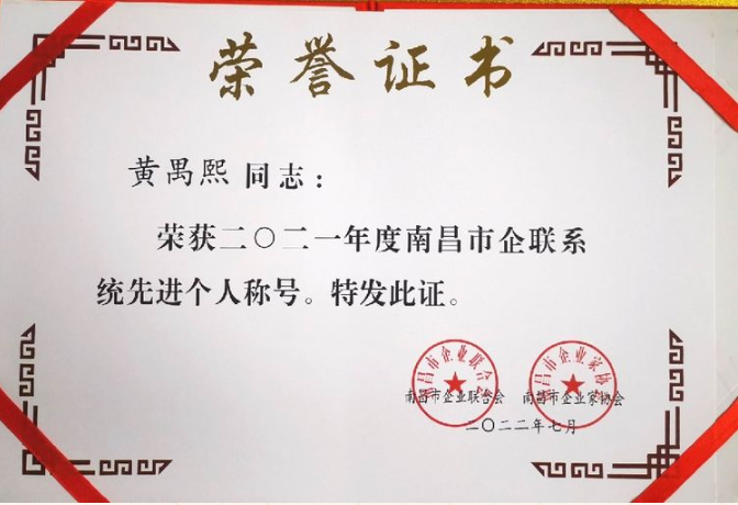 贛昌砂石公司企業(yè)管理部部長黃禺熙榮獲“2021年度南昌市企聯系統(tǒng)先進個人”榮譽稱號。