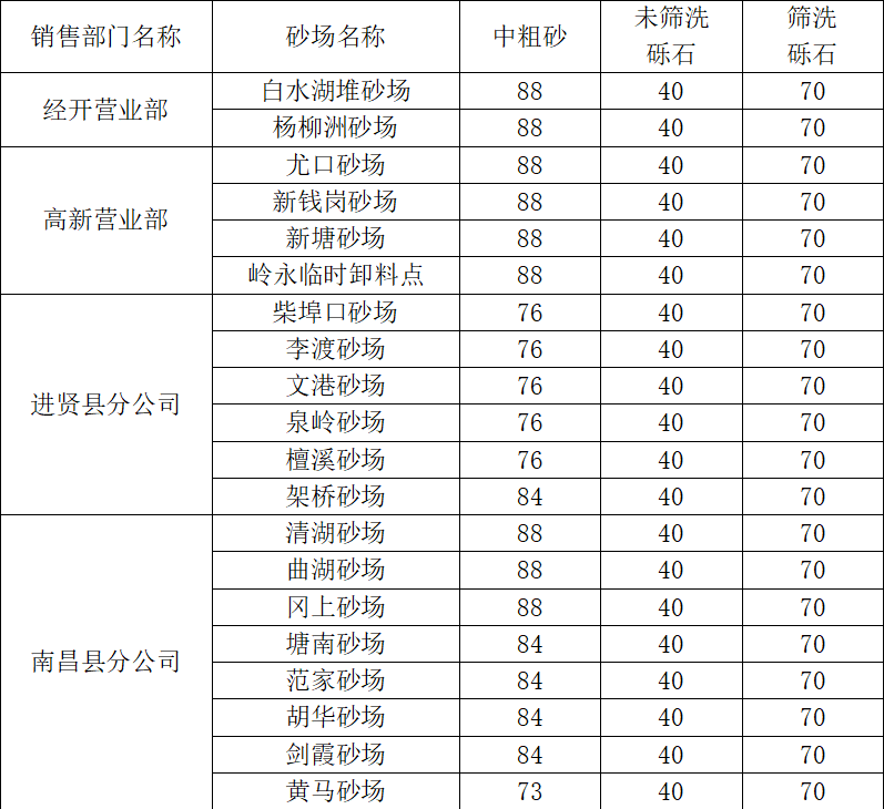 感謝您長期以來對(duì)南昌贛昌砂石有限公司的認(rèn)可與支持。結(jié)合市場行情變化,經(jīng)公司研究決定,對(duì)贛昌砂石公司砂石銷售價(jià)格調(diào)整如下: