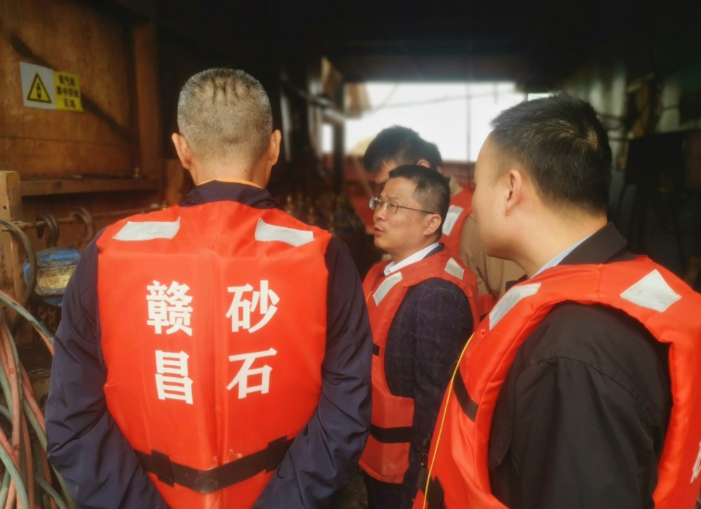 陳鴻一行來到贛撫尾閭項目畫眉咀料場,現(xiàn)場聽取了重點項目部負責人就項目開采、作業(yè)設備及安全管理等情況的簡要匯報,并對作業(yè)船只安全設施配備、安全隱患等情況進行了檢查。在檢查的過程中,陳鴻對船只上安全設施的擺放、安全通道的暢通以及電線的布置都提出了進一步的整改要求。