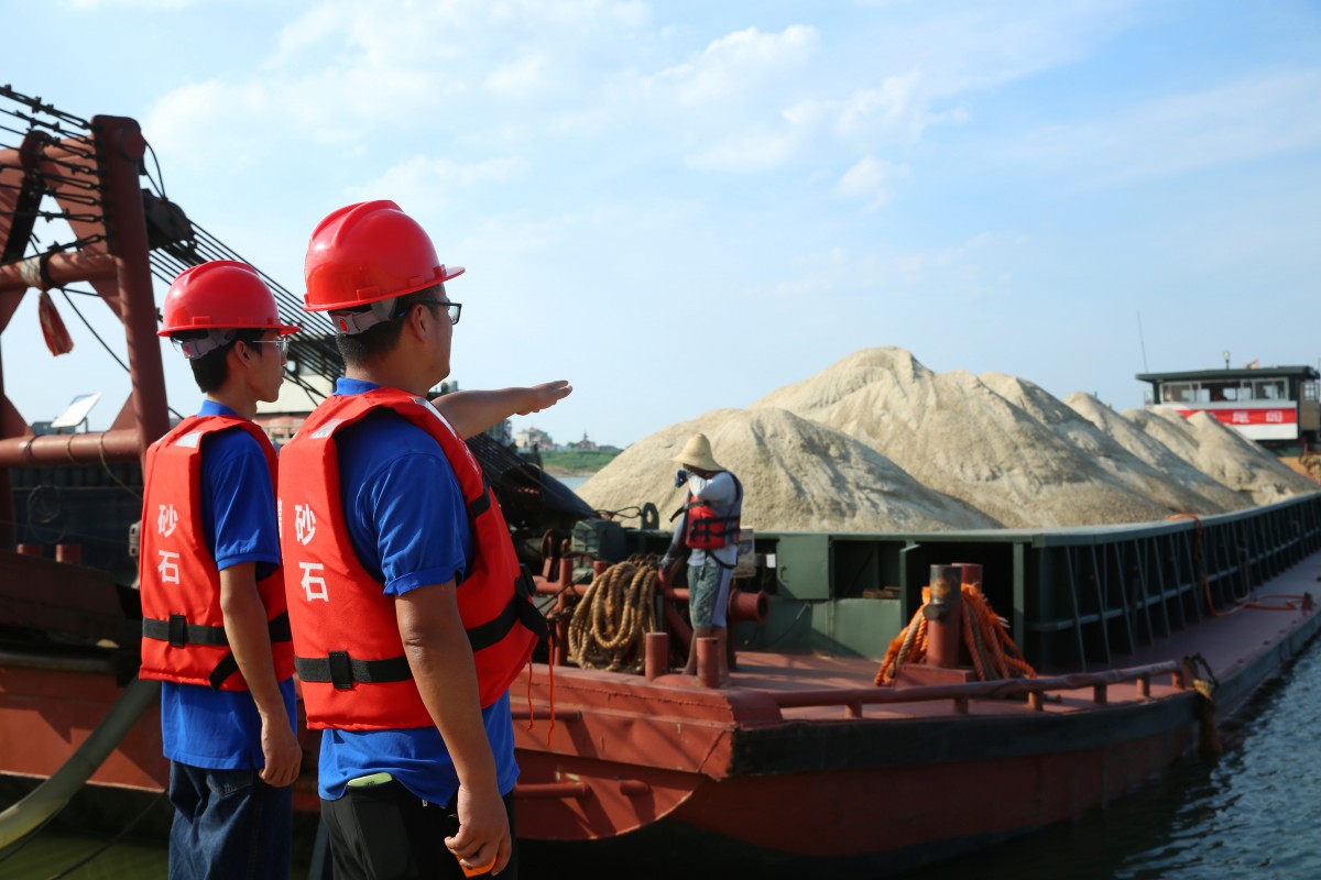 發(fā)貨員陶小毛、熊劍的身影出現(xiàn)在烈日下,在江邊等待著即將靠岸的運力船,為了安全他們頭戴安全帽、身穿印有贛昌砂石logo的紅色救生衣、腳踩套鞋,這身裝備仿佛將他們整個人置身于密不透風(fēng)的高溫鐵桶里,即使什么都不做都能出一身汗,更別說要登上被陽光曬得燙腳的鐵皮甲板了。但他們依舊仔細(xì)核對著運砂船的各項數(shù)據(jù),做著砂石入庫前的準(zhǔn)備,仿佛忘記從四面八方襲來的滾滾熱浪。