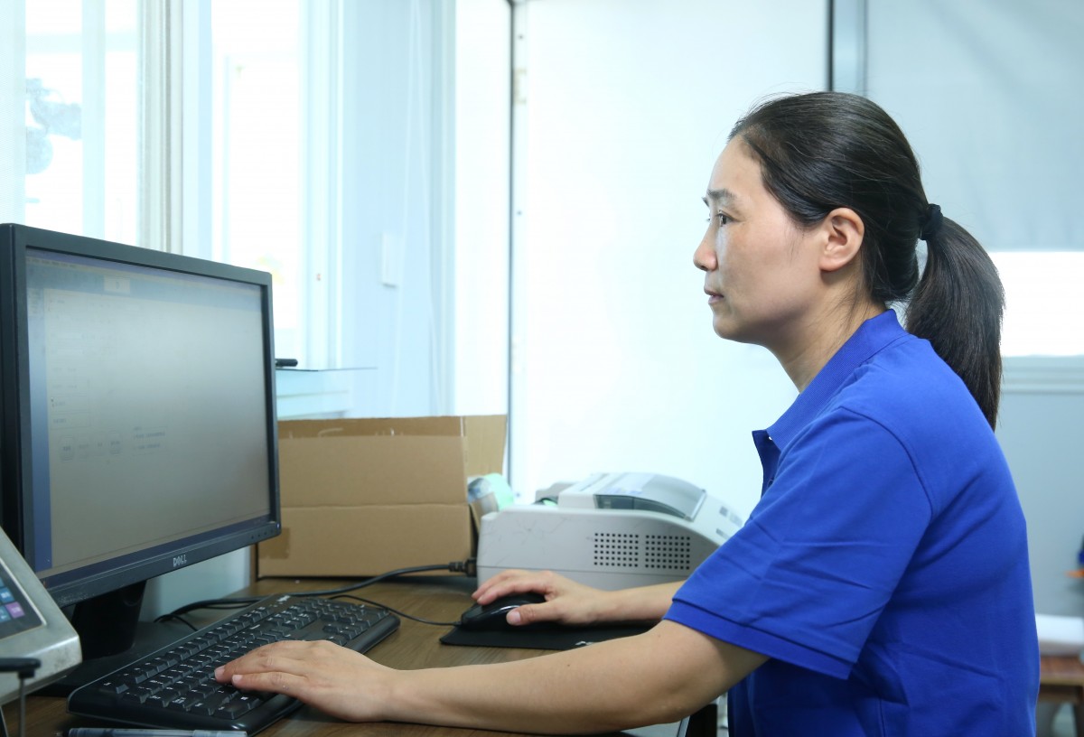 在磅房中,窗口吹進(jìn)的熱浪一陣又一陣,但是發(fā)貨員蔡文娟的臉上也并未出現(xiàn)一絲疲態(tài)的痕跡正在認(rèn)真做著運輸車輛出場前的稱重打榜工作。