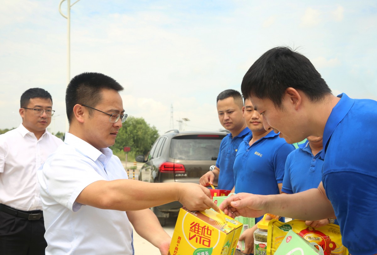7月26日,南昌交投集團高管,原南昌水投董事、副總經(jīng)理陳鴻一行赴贛昌砂石公司高新銷售中心尤口砂場看望慰問堅守在一線的職工,為他們送去防暑降溫物資。南昌交投集團黨群工作部副部長李凌清、安全生產(chǎn)部相關人員,贛昌砂石公司黨委書記、董事長唐曉飛,總經(jīng)理助理葉劍飛等陪同。