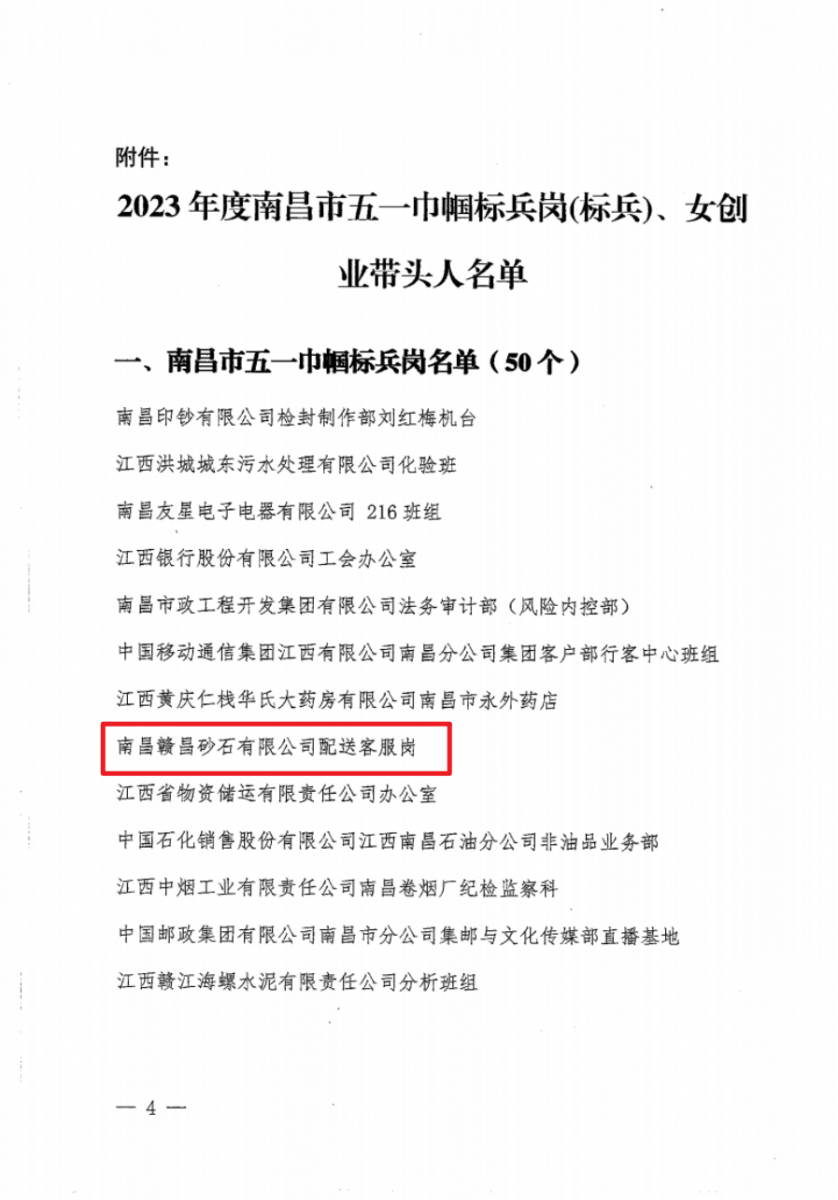 近日,南昌市總工會印發(fā)《南昌市總工會關(guān)于表揚(yáng)2023年度南昌市五一巾幗標(biāo)兵崗(標(biāo)兵)、命名南昌市女創(chuàng)業(yè)帶頭人的通報》,其中,贛昌砂石公司配送客服崗獲得“南昌市五一巾幗標(biāo)兵崗”榮譽(yù)稱號!