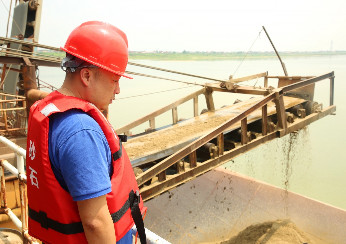 頭頂著烈日,贛昌砂石公司開采管理中心南贛4號采區(qū)班組的工作人員正在對砂石采挖情況進行仔細的檢查。他們時刻關(guān)注設(shè)備的運行情況。盡管水面蒸騰的熱氣和長時間的暴曬使他們滿臉通紅,汗流浹背,但他們?nèi)匀痪ぞI(yè)業(yè)地工作。